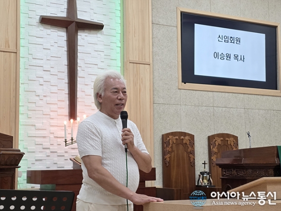 | 이승원 목사가 신입회원 인사말을 하고 있다. |