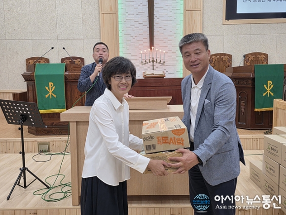 | 박상진 장로(오른쪽)가 한정란 원포교회 사모에게 물품을 전달하고 있다. |