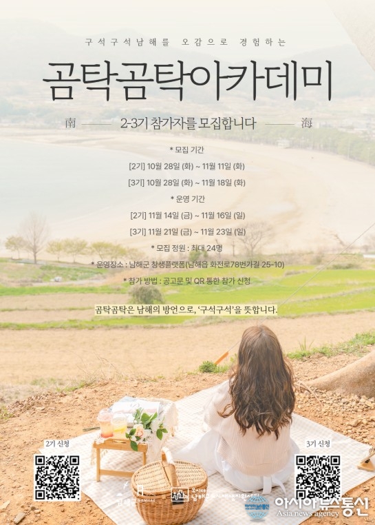 [아시아뉴스통신=장희연 기자] 남해군은 보물섬 남해의 다채로운 인사이트를 전하는 ‘2025 남해군 보물섬 곰탁곰탁 아카데미’ 2~3기 수강생을 10월 28일부터 모집한다고 밝혔다.