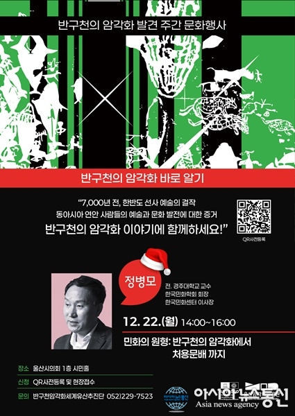 [아시아뉴스통신=이상진 기자] 울산암각화박물관은 오는 12월 22일 오후 2시 울산시의회 1층 시민홀에서 ‘명사특강: 반구천의 암각화 바로 알기’ 두 번째 강연을 개최한다고 밝혔다.