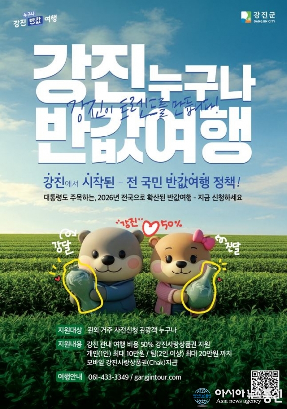 [아시아뉴스통신=김주호 기자]‘설 연휴 맞아 가족·자녀·지인과 함께 강진에서 여행은 반값, 기쁨은 두 배!’