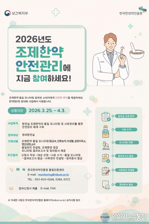 [아시아뉴스통신=윤석원 기자] 한국한의약진흥원은 전국 원외탕전실을 대상으로 '조제한약 품질 모니터링 사업' 참여기관을 모집한다.