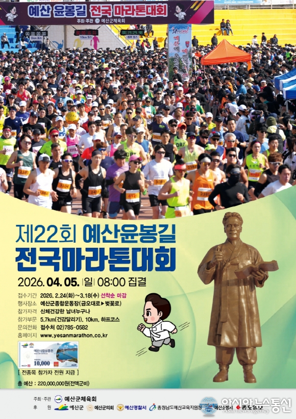 27일 예산군에 따르면 이번 대회는 참가 접수 시작 3일 만인 지난 2월 26일 조기 마감될 정도로 높은 관심을 모았으며, 최종 5654명이 참가 신청을 마쳤다.