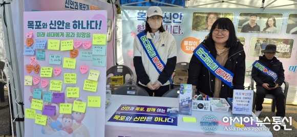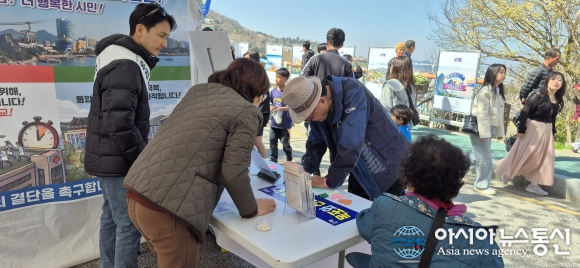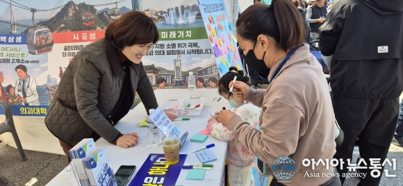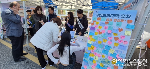 | 목포시 큰목포기획단의 국립의과대학 유치 부스에 많은 시민들의 참여가 잇따랐다. 시민들은 "36년 서남권 주민들의 숙원이 이제는 실현돼야 한다", "국립의과대학은 반드시 목포로 와야 된다"는 염원을 담은 쪽지를 붙이며 의대유치를 기원했다./아시아뉴스통신=고정언 기자 |