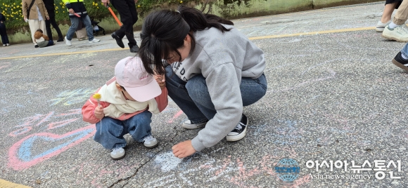 | 2026 유달산봄축제가 4~5일 '꽃피는 순간 봄날의 소풍'을 주제로 열린 가운데 유달산 일주도로 아스팔트 그림판에 엄마와 아이가 하트를 그리고 있다./아시아뉴스통신=고정언 기자 |