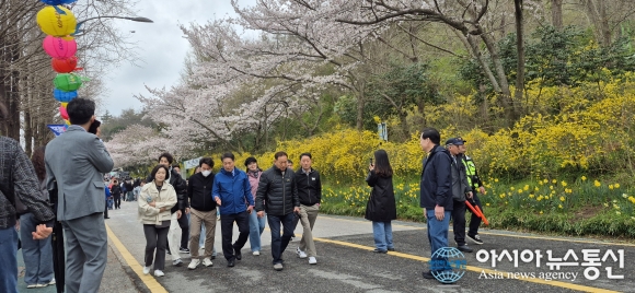 | 2026 유달산봄축제가 4~5일 '꽃피는 순간 봄날의 소풍'을 주제로 열린 가운데 유달산 느림봄 걷기 행사에 참가한 조성오 시의장, 정현택 목포상공회의소 회장이 일주도로를 걷고 있다. 4일 느림보 걷기 행사에는 예약 400명과 현장 접수 100여명등 500명을 훌쩍 넘겼다./아시아뉴스통신=고정언 기자 |