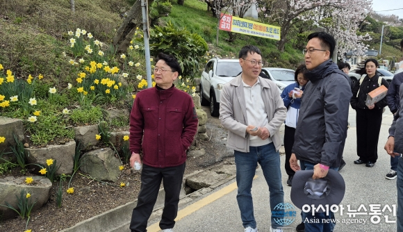 | 2026 유달산봄축제가 4~5일 '꽃피는 순간 봄날의 소풍'을 주제로 열린 가운데 장헌민 공원녹지과장이 조석훈 목포시장 권한대행에게 수선화를 식재하게 된 배경에 대해 설명하고 있다./아시아뉴스통신=고정언 기자 |