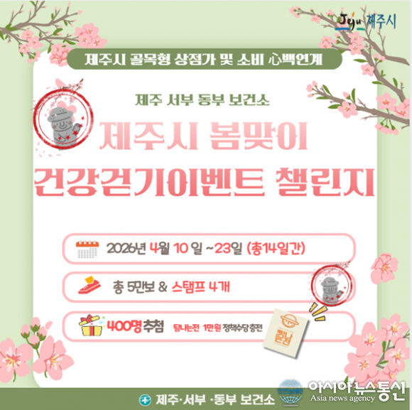 [아시아뉴스통신=정정호 기자] 제주보건소는 봄철을 맞아 시민들의 걷기 실천을 활성화하기 위해 4월 10일(금)부터 4월 23일(목)까지 ‘골목형 상점가 연계 봄맞이 건강 걷기 이벤트 챌린지’를 운영한다.