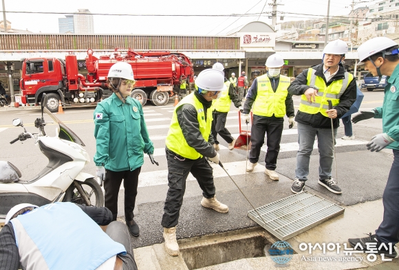 현장에서는 전문장비 흡입준설차 2대가 동원돼 하수구 내부 청소와 빗물받이에 쌓인 담배꽁초 등 각종 협잡물을 제거하는 작업이 병행됐다.