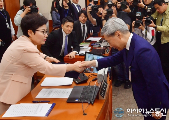| 임이자 재정경제기획위원회 위원장이 15일 서울 국회 재정경제기획위원회 인사 청문회에서 신현송 한국은행 총재 후보자와 악수를 하고 있다./아시아뉴스통신=김용진 기자 |