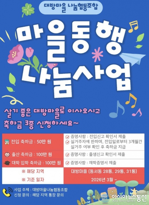 이번 사업은 대방마을나눔협동조합이 주관하며, 신청 및 문의는 해당 지역 통장을 통해 가능하다.