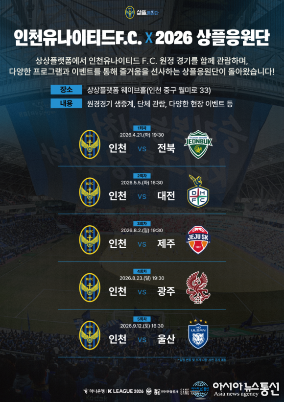 [아시아뉴스통신=조은애 기자] 인천관광공사(사장 유지상)는 인천유나이티드(대표이사 조건도)와 함께 ‘인천유나이티드F.C. X 2026 상플응원단’을 공동 개최한다고 17일 밝혔다.