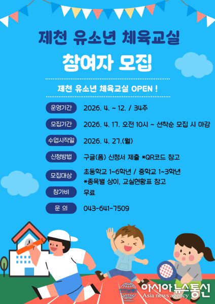 [아시아뉴스통신=장하영 기자] 제천시체육회(회장 안성국)는 지역 유소년의 체육활동 참여 확대와 체력 증진을 위해 ‘제천 유소년 체육교실’을 오는 4월 27일부터 운영한다고 밝혔다.