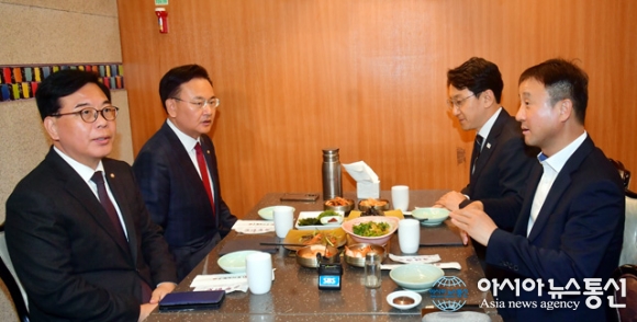 | 한병도 더불어민주당 원내대표와 송언석 국민의힘 원내대표가 20일 서울 여의도의 한 음식점에서 회동을 하고 있다./아시아뉴스통신=김용진 기자 |