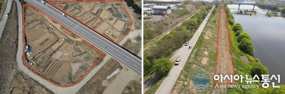 | 달성군 다사읍 박곡리(왼쪽), 이천리 금호강 구간 내 불법경작지 행정대집행 실시 후 모습.(사진제공=달성군청) |
