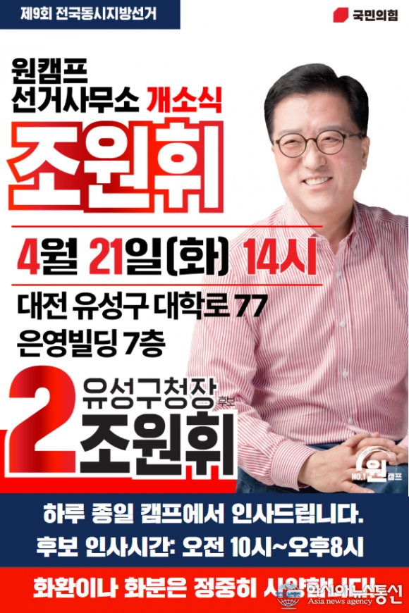 [아시아뉴스통신=박희석 기자] 조원휘 유성구청장 에비후보는 오는 21일 유성구 대학로 77 은영빌딩에서 선거사무소 개소식을 개최한다고 밝혔다.