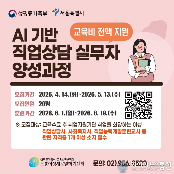 [아시아뉴스통신=윤자희 기자] 서울 도봉구가 도봉여성센터에서 ‘AI 기반 직업상담 실무자 양성과정’을 운영한다고 밝혔다. 대상은 직업상담사, 사회복지사, 직업능력개발훈련교사 등의 자격증을 소지하고, 취업지원 분야로 취업을 희망하는 여성 구직자다.