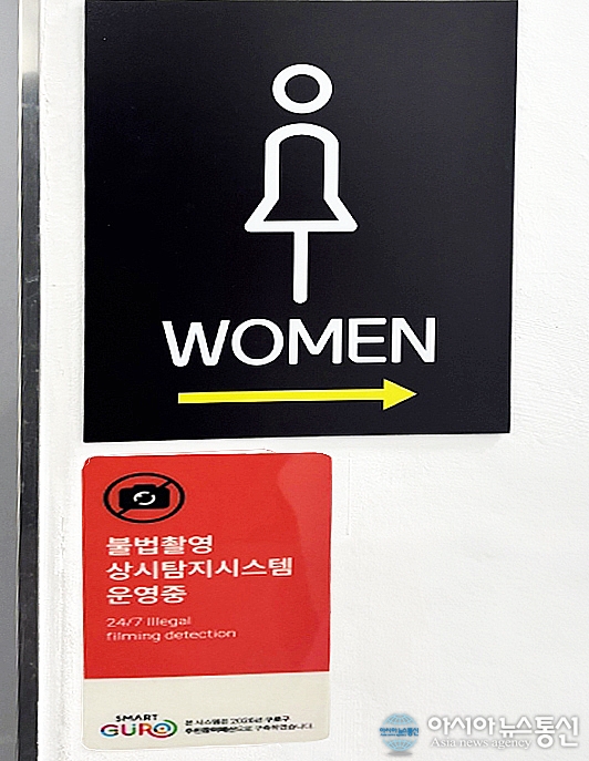 | 구로구민체육센터 화장실 앞 '불법촬영 탐지시스템' 운영중 안내 표시/사진제공=구로구청 |