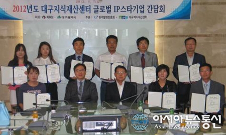 대구상공회의소 지식재산센터(회장 김동구)는 지난 7일 대구상의 챔버룸에서 2012년도 글로벌 IP스타기업에 대한 지정서를 전달하는 '2012년도 글로벌 IP스타기업 간담회'를 가졌다.