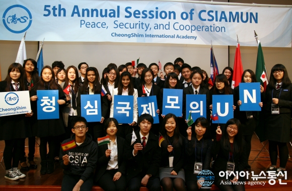 | 지난 15일부터 17일까지 경기 가평에 위치한 청심국제중고에서 한국, 홍콩, 인도 등 아시아 5개국 학생 160여명이 참여한 가운데 '제5회 청심국제모의유엔(CSIAMUN)' 행사가 열린 가운데 참가 학생들이 UN 가입국가 깃발을 들고 기념촬영을 하고 있다.(사진제공=청심국제중고) |