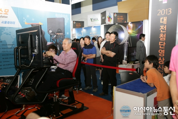 | 18일 대전컨벤션션센터 에서 열린 첨단영상전 4D오토빌 체험관에서 관람객이 체험을 하고 있다.(사진제공=대전시청) |
