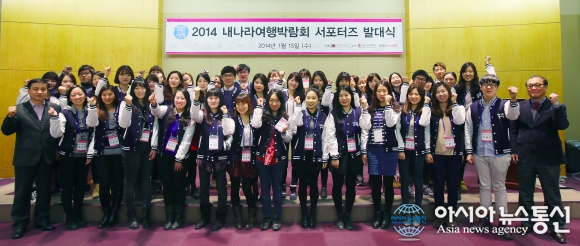 15일 서울 삼성동 코엑스에서 열린 2014 내나라여행박람회 '내나라 서포터즈 3기' 발대식에서 서포터즈단이 기념촬영을 하고 있다.(사진제공=한국관광협회중앙회)