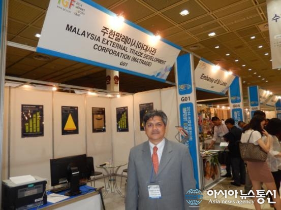 | 2014 수입상품전시회 마트레이브 부스 앞에서 라쉬드 모하마드 제인(A.Rashid Mohd Zain) 말레이시아 수출진흥공사 대표.(사진제공=마트레이드) |