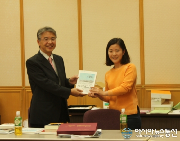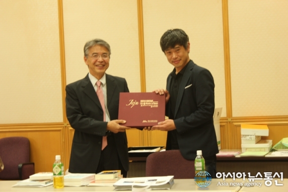 | 사이토씨에게 제주 사진집을 선물하는 제주특별자치도 문화정책과 홍상환씨. /아시아뉴스통신=이재정 기자 |