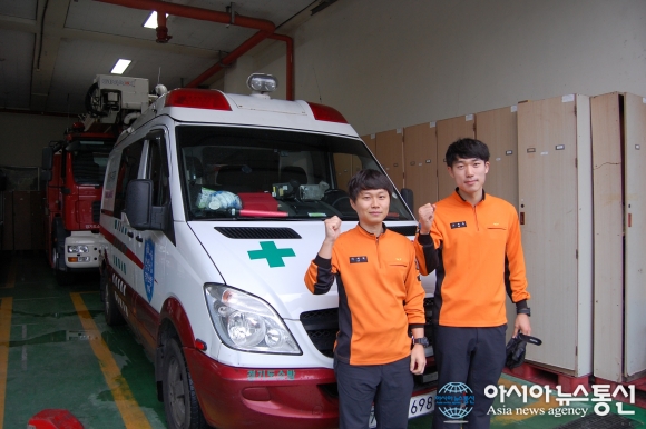 | 26일 오후 12시 10분쯤 경기 안성소방서(서장 권은택)는 도기119안전센터와 미양119안전센터 대원들이 미양면 소재 A공구상가 내에서 의식을 잃고 쓰러진 A씨(41)를 구조했다고 밝혔다.(사진 왼쪽부터 도기 119안전센터 이재덕, 오새동 대원).(사진제공=안성소방서) |