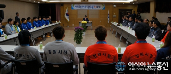 안상수 경남 창원시장은 27일 오전 ‘제96회 전국체육대회’에 출전해 창원시를 빛낸 창원시청 직장운동경기부 메달리스트들과 체육관계자들을 초청, 환영식을 갖고 격려했다.