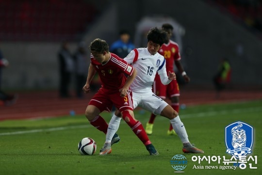 | U-17 칠레월드컵 16강 벨기에전에서 볼을 경합 중인 윤종규.(사진출처=대한축구협회) |