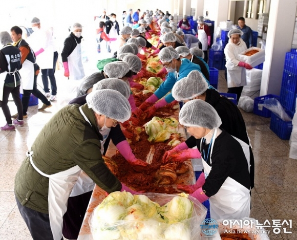 | 3일 공주시 백제체육관에서 애터미 임직원100여명이 참여한 가운데 복지소외계층 1000세대에 사랑의 배추김치 1만kg을 전달하기 위한 김장을 담그는 손길이 분주하다.(사진제공=공주시청) |