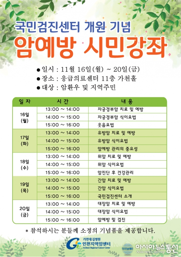 암 환우 및 인천시민 누구나 사전 등록 없이 무료로 참석가능하다.