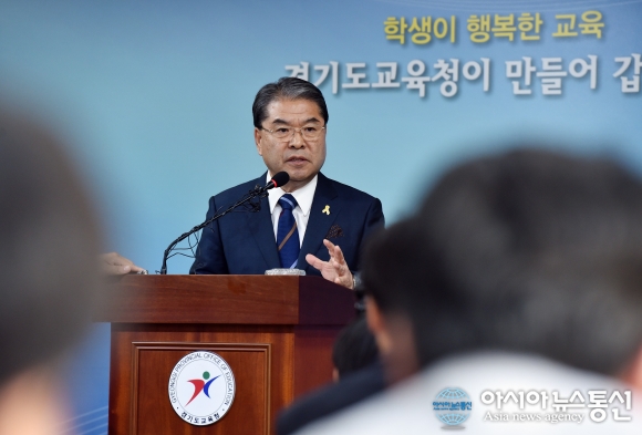| 지난 3일 경기도교육청에서 이재정 교육감이 교육부의 역사교과서 국정화 고시 철회를 요구하는 입장을 밝히고 있다./아시아뉴스통신DB |