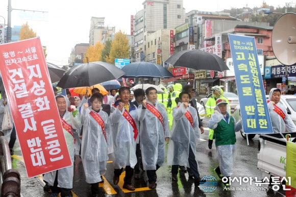 경기 광명~서울민자고속도로건설반대범시민대책위원회(이하‘범대위’)는 13일 광명시민회관 앞에서 시민과 지역정치인 등 500여명이 참석한 가운데 광명~서울간 민자고속도로 지상화 건설에 반대하는 촉구대회를 가진 뒤 거리 캠페인을 실시했다.
