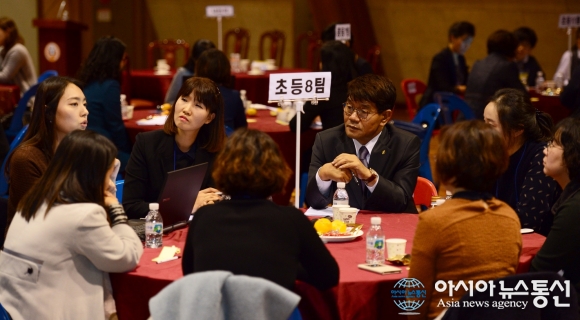 | 13일 인천교육청은 인천시 부평구 제일고등학교에서 인천시 초, 중, 고 보건교사 200여명을 대상으로 ‘건강한 학교야, 웃어라’라는 주제로 원탁토론회를 진행하고 있다. 사진은 이청연 인천시교육감이 참석자들과 토론을 하고 있는 모습.(사진제공=인천시교육청) |