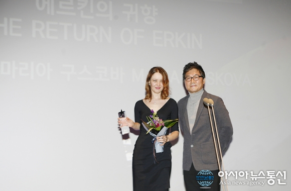 | 제13회 아시아나국제단편영화제 국제경쟁 심사위원 특별상을 수상한 '에르킨의 귀향'의 마리아 구스토바 감독과 강제규 심사위원장.(사진제공=아시아나국제단편영화제) |