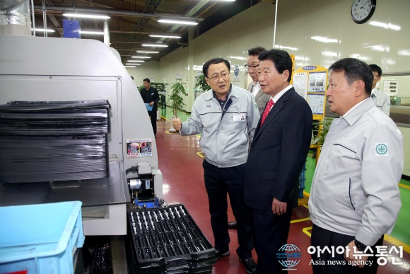 | 17일 안상수 경남 창원시장이 GMB코리아(주)를 방문, 생산현장을 둘러보고 있다.(사진제공=창원시청) |