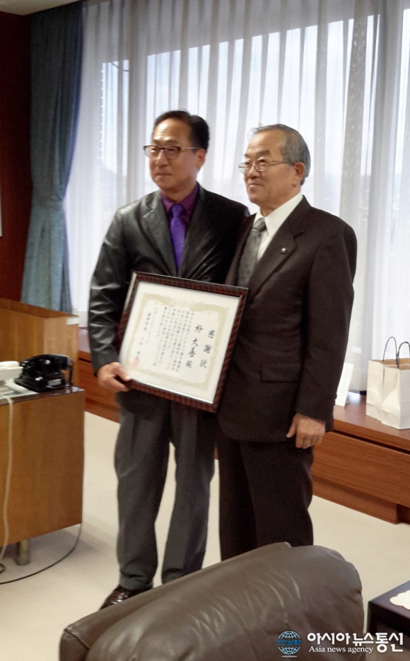 | 박대선 한·일경복교류회장(사진 왼쪽)이 코야마타츠오 후쿠츠 시장으로부터 양국의 우호교류 증진에 기여한 공로로 감사장을 수여 받고 기념촬영을 하고 있다.(사진제공=한·일경복교류회) |