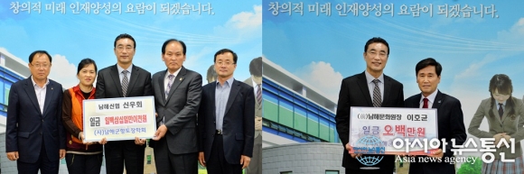 | (사)남해군 향토장학회에 장학금 기탁 모습.(사진제공=남해군청) |