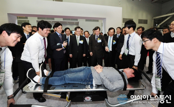 | 창의적종합설계경진대회 국무총리상 수상작인 '자동 수평유지 들것' 시연 모습.(사진제공=영남대) |
