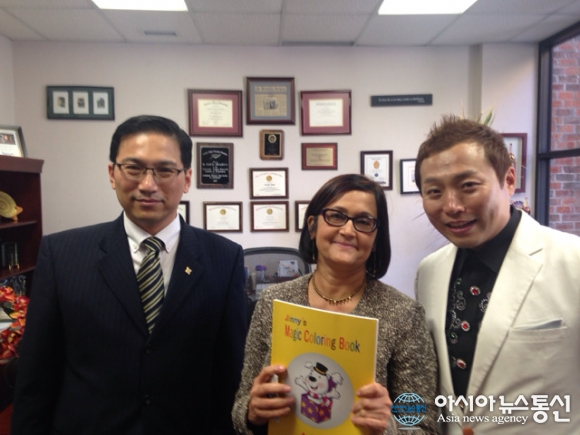 | 함현진 마술사(오른쪽)가 임성배 교수(왼쪽)와 성메리스 대학 학장(중앙)과 함께 기념 촬영을 하고 있다.(사진제공=성메리스대학) |