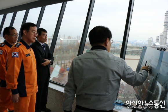 | 19일 조송래 중앙소방본부장(왼쪽)이 인천SK석유화학을 방문해 관계자로부터 브리핑을 받고 있다.(사진제공=인천소방안전본부) |