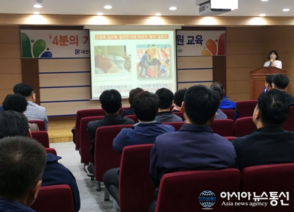 대전시설관리공단(이사장 김근종)은 공단 홍보실에서 ‘4분의 기적 심폐소생술’이라는 주제로 전 직원 대상 안전교육을 실시했다고 19일 밝혔다.