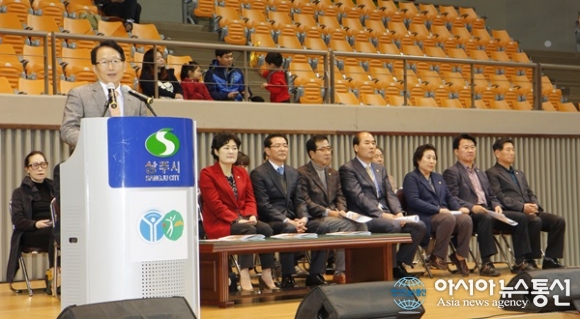 | 21일 김종태 국회의원이 '제19회 경상북도지사기생활체육에어로빅스체조대회' 개회식에서 축사를 하고 있다. 이정백 상주시장, 이동욱 경북도 체육진흥과장, 강영석 이운식 도의원, 남영숙 상주시의회 의장, 박영문 전 KBS미디어사장, 김성태 임부기 성재분 시의원, 서동령 상주시생체회장 등이 참석했다./아시아뉴통신=김철희 기자 |