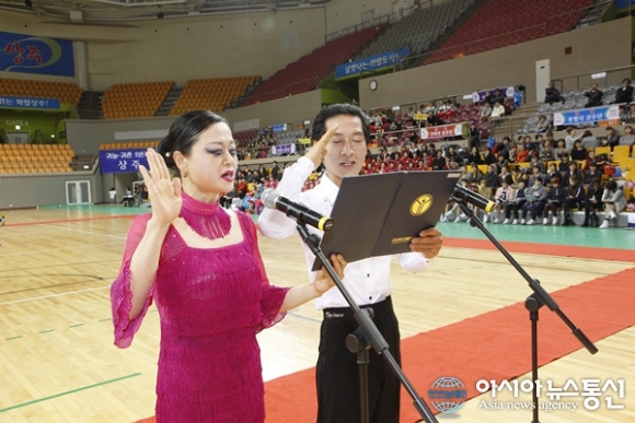 | 안옥기 박소은씨(오른쪽부터)가 참가선수를 대표해 선서를 하고 있다./아시아뉴통신=김철희 기자 |