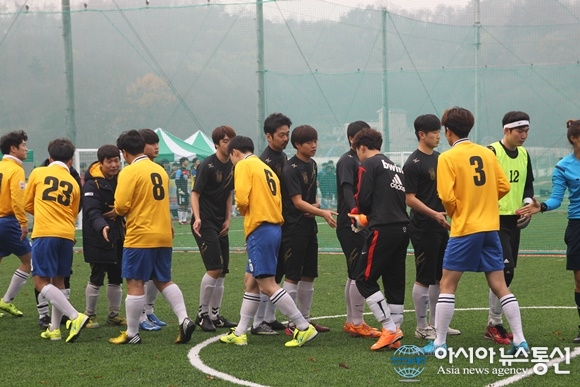 | 21일 충북 청주시 서원구 남이면 가좌리 청주풋볼센터에서 제2회 직지배풋살대회가 열린 가운데 경기를 시작하기 전 선수들이 인사를 나누고 있다./아시아뉴스통신=김지수 기자 |