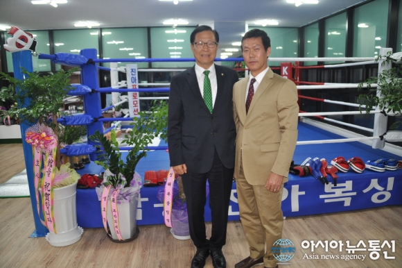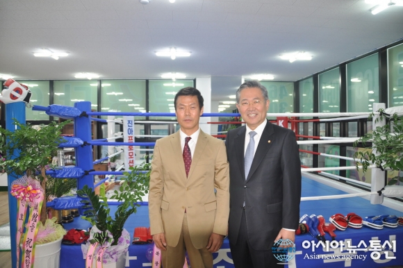| 20일 오후 8시 인천 남동구 구월1동 아시아드선수촌아파트내 드림프라자 5층 "남동진아복싱체육관" 개관식개관식에 참석한 문병호 의원(왼쪽)이 안진아 관장(오른쪽)과 기념촬영을 하고 있다./아시아뉴스통신=김태일, 이명기 기자 |