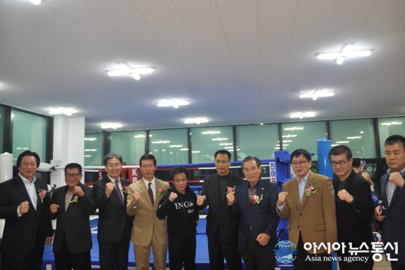 | 20일 오후 8시 인천 남동구 구월1동 아시아드선수촌아파트내 드림프라자 5층 "남동진아복싱체육관" 개관식개관식에서 오픈기념 시범경기가 열리기 전 내빈들이 기념촬영을 하고 있다./아시아뉴스통신=김태일, 이명기 기자 |