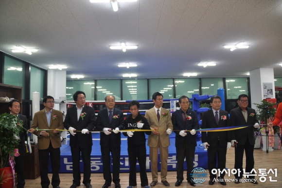 | 20일 오후 8시 인천 남동구 구월1동 아시아드선수촌아파트내 드림프라자 5층 "남동진아복싱체육관" 개관식개관식에서 내빈들이 테이프 컷팅식을 하고 있다./아시아뉴스통신=김태일, 이명기 기자 |